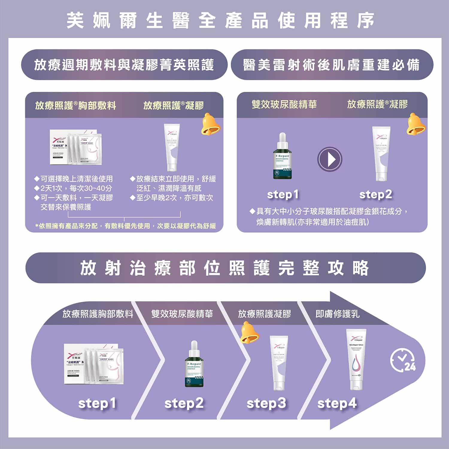 放療照護凝膠可強力鎖水保濕,使肌膚留住水份,維持滋潤,並活化修復肌膚,強化表皮的保護力,使肌膚加倍水嫩,由內而外恢復光澤亮麗。運用專利萃取技術,搭配高濃度玻尿酸、維他命B3、維他命B5與多重保濕植粹,使用後強化肌膚屏障,改善乾燥粗糙表皮,讓肌膚柔嫩亮白有彈性。